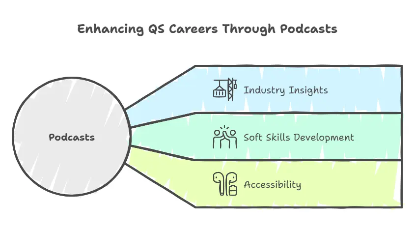 Second, podcasts help to develop soft skills like negotiation, communication, and leadership—all of which are absolutely vital for career advancement. You can thus easily and quickly learn on your daily commute, in the gym, or during breaks since you can listen to podcasts everywhere, anyplace. Whether your level of experience is that of a novice, student, or seasoned QS professional, the right podcasts will enable you to learn and further your career.