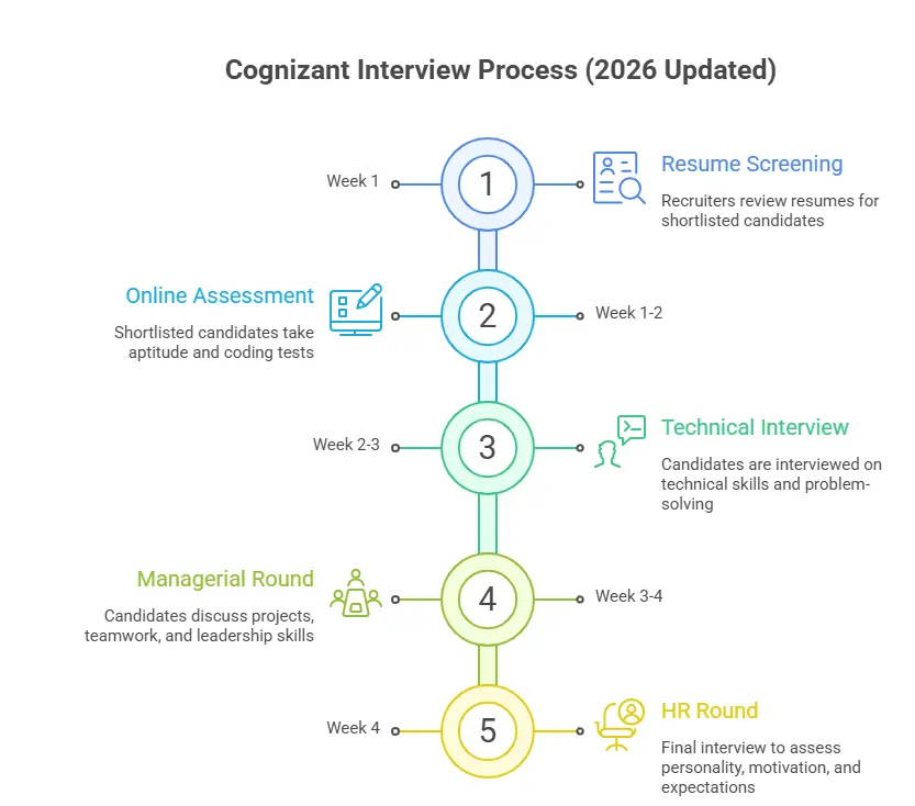 The interview process at Cognizant is designed to check both your technical skills and your overall personality. The full process usually takes 2–4 weeks, has a moderate difficulty level, and an estimated selection rate of 10–20%. With proper preparation, it becomes much easier to handle.