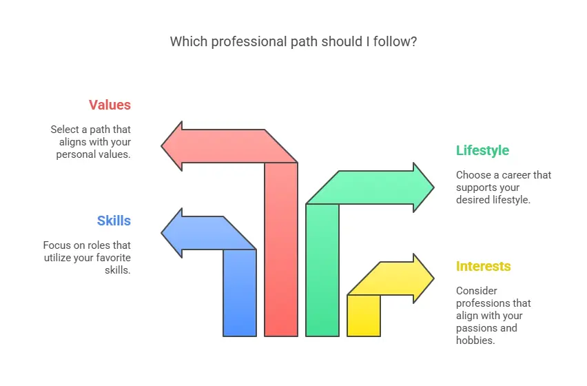Your long-term goals, values, interests, and strengths will help you decide which professional path to follow. Ask yourself first what kind of profession interests you, what skills you love using, and what kind of lifestyle you would want to have. Research several sectors and kinds of employment to find which best fit your own and work-life values. Create SMART goals—specific, measurable, achievable, relevant, and time-bound—to give your objectives direction and organization. Remember that your career objectives ought to be flexible enough to change with your development and education.