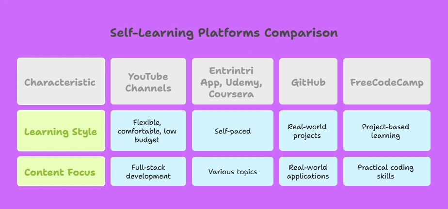 You can also depend on the Entri App, Udemy, and Coursera for self-paced learning. GitHub offers oration of the real world, while FreeCodeCamp their learning methodology on projects at your comfort and be a tech-savvy person in less time!