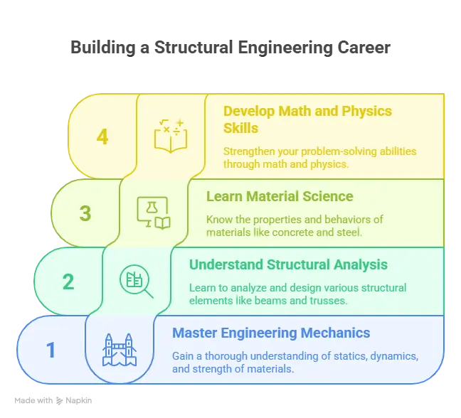 To begin with, a strong foundation is important in mathematics, physics and nuclear principles. Competence in knowledge of structural analysis, design concepts and construction materials creates spinal cord. In addition, design is highly recommended with design software such as AutoCAD and Staad.Pro.