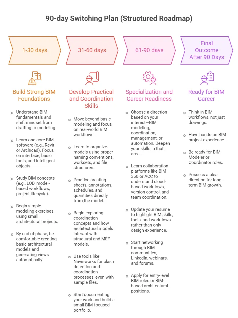 Switching to BIM is a transition, not a reset. With a focused 90-day plan, architects can confidently step into a future-ready BIM career.