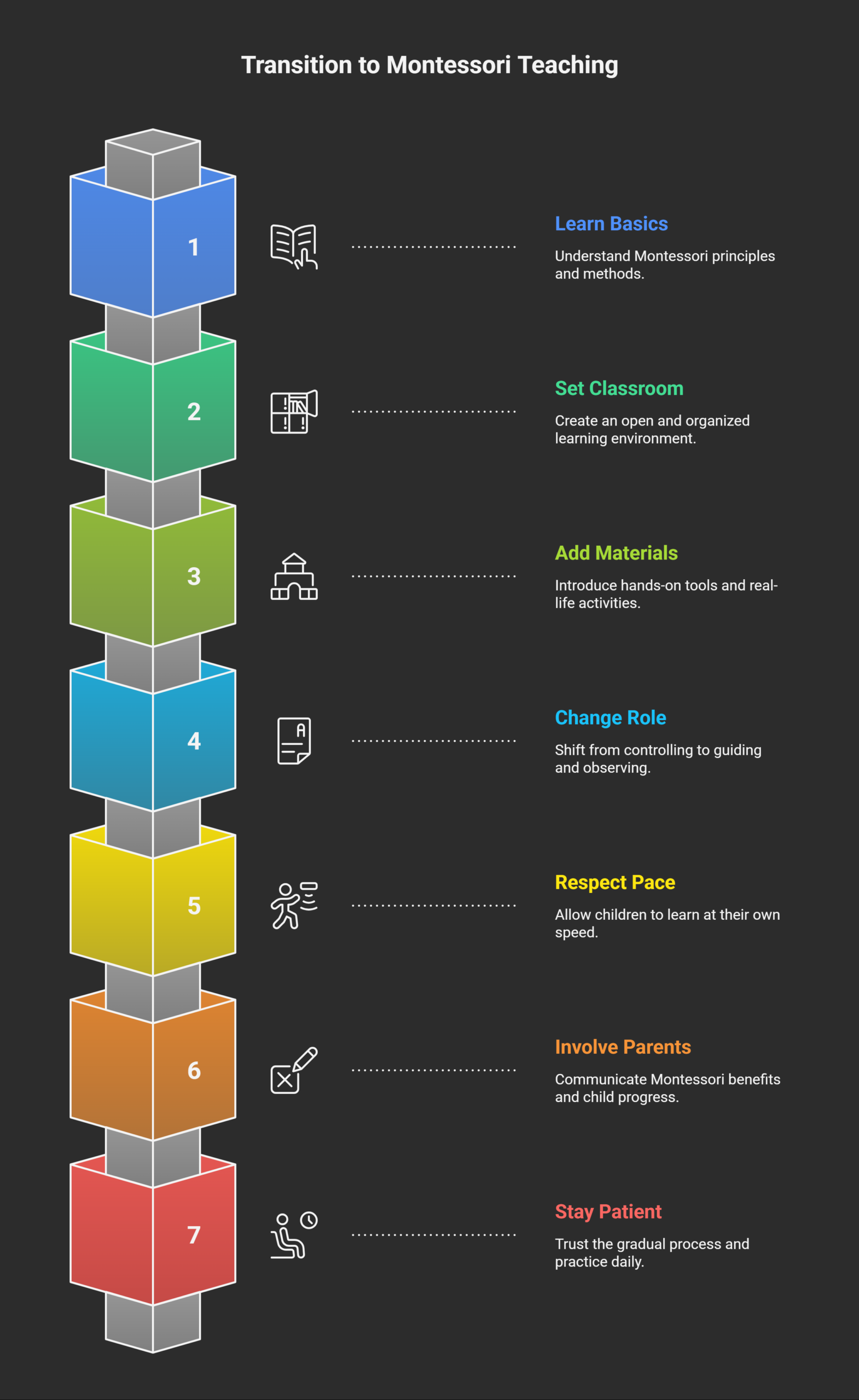 Switching to Montessori takes time and patience. Teachers should move slowly, step by step. Small changes in the classroom bring big results. The focus is on guiding, not controlling. Here are simple steps to make the change.