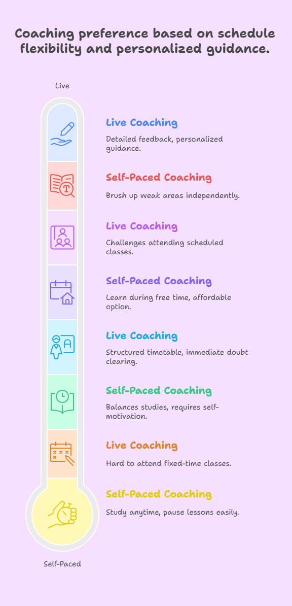 Generally, yes. Live coaching involves direct interaction with trainers, scheduled classes, and sometimes offline facilities, increasing costs. Self-paced courses are mostly app or video-based, requiring fewer resources and thus costing less. However, prices vary depending on the institute and course features. Always compare what’s included before deciding.