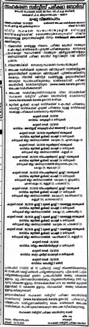 Junior Clerk | SSLC or equivalent as basic qualification, plus one of the following: – Subordinate Personal Co-operative Training Course (Junior Diploma in Co-operation), or – B.Com with Co-operation as an elective, or – BSc (Co-operation & Banking) from Kerala Agricultural University, or – Co-operative Higher Diploma (HDC or HDC & BM). |