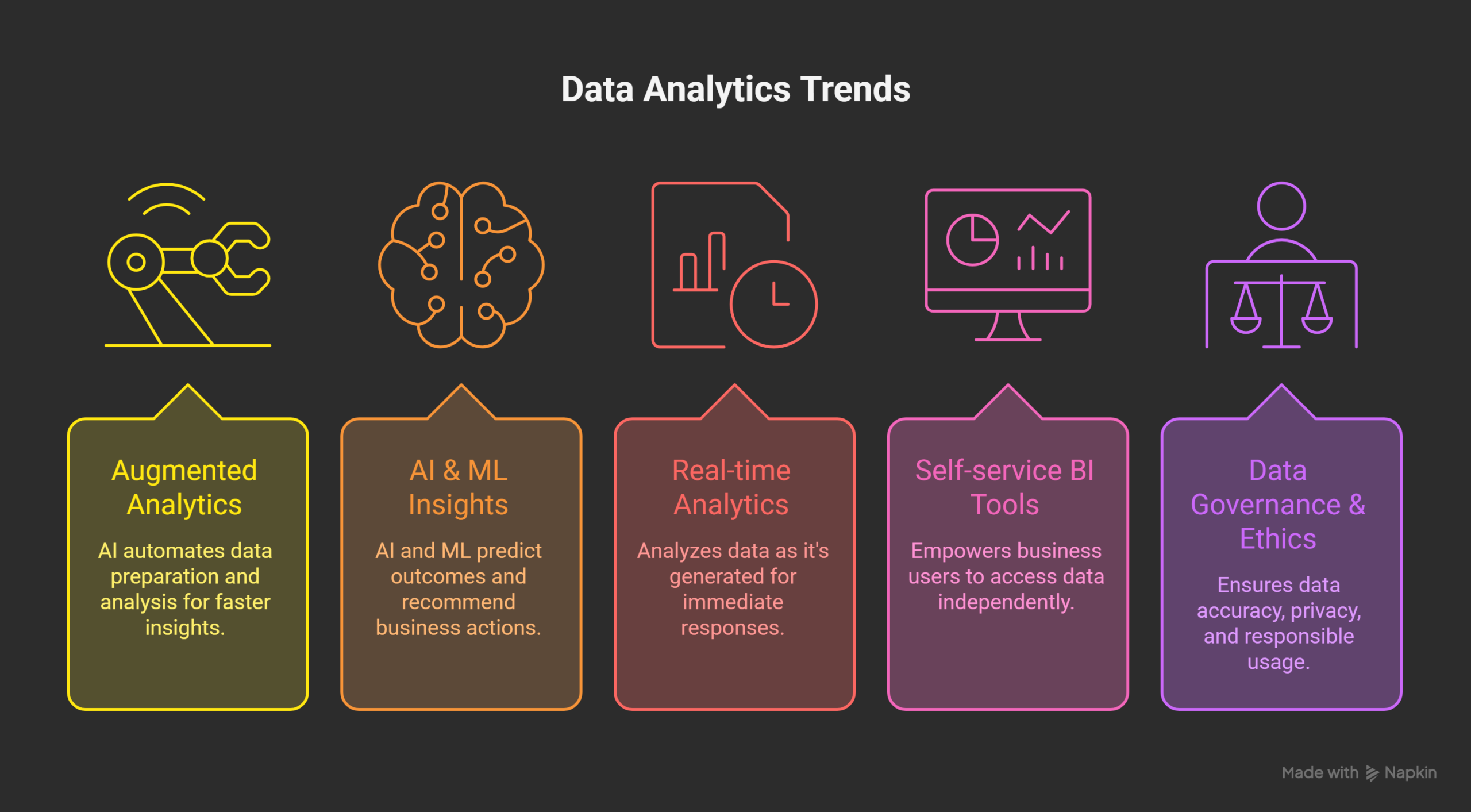 Key trends include augmented analytics, AI and machine learning-driven insights, real-time analytics, self-service BI tools, and strong focus on data governance and ethics, all of which aim to make analytics faster, more accessible, and more trustworthy.