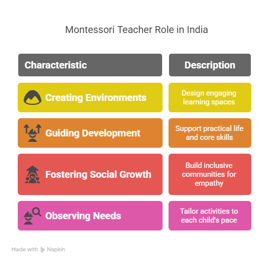 Montessori teachers are facilitators, not lecturers, guiding children through self-directed learning, per American Montessori Society (AMS). In 2025, India’s focus on quality early education fuels demand for skilled educators, especially in Kerala, where 60% of parents prefer Montessori. Their role includes:
