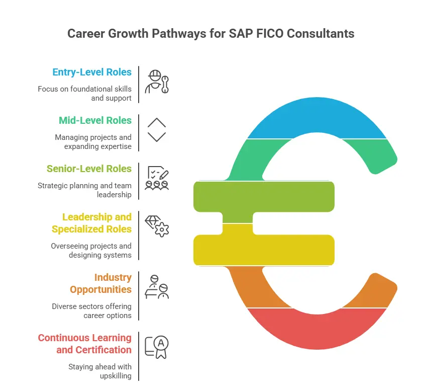 The career typically progresses from Junior Consultant → SAP FICO Consultant → Senior Consultant → Lead Consultant → Project Manager or Solution Architect. With experience and leadership skills, professionals can move into Finance Transformation or SAP Program Management roles.
