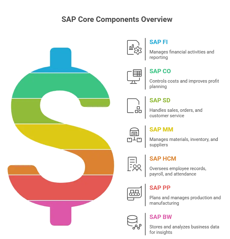 SAP is a powerful business software that helps companies manage their daily work in an easy and organized way. It is made up of different components like finance, sales, HR, inventory, and production, and each one has a specific role.
