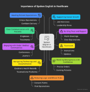 Spoken English is critical for doctors and nurses because it ensures clear communication with patients and teams. In hospitals, patients need to understand diagnoses, treatments, and instructions. If a doctor’s English is unclear, a patient might misinterpret how to take medicine, leading to serious errors. For example, saying “take one pill daily” but being misheard as “weekly” can harm health. Nurses also rely on Spoken English to update doctors or calm anxious patients. Clear speech builds trust, making patients feel safe. In diverse hospitals, English is often the shared language among staff from different countries. Without strong Spoken English, teamwork suffers, and mistakes happen, like giving the wrong dose. A 2020 study showed 25% of hospital errors came from poor communication. Spoken English also helps professionals explain medical terms in simple ways, ensuring patients follow care plans. For instance, a nurse explaining a heart condition in clear English helps a patient stick to their diet or exercise. This skill reduces risks, improves outcomes, and meets patient expectations for quality care.